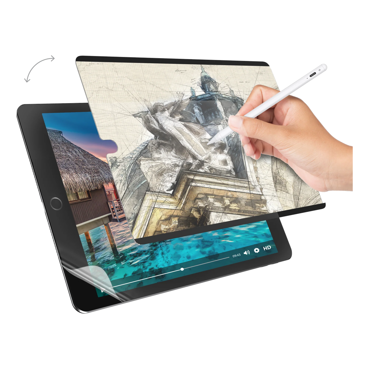 磁吸式設計|繪畫裝上享受擬真紙感、觀看取下還原高解析螢幕|紙質手感,筆觸精準自然|堅韌耐用材質可重複使用,不易刮傷螢幕|可水洗清潔|細緻霧質表面降低反光、減少指紋殘留|附贈專屬收納夾
