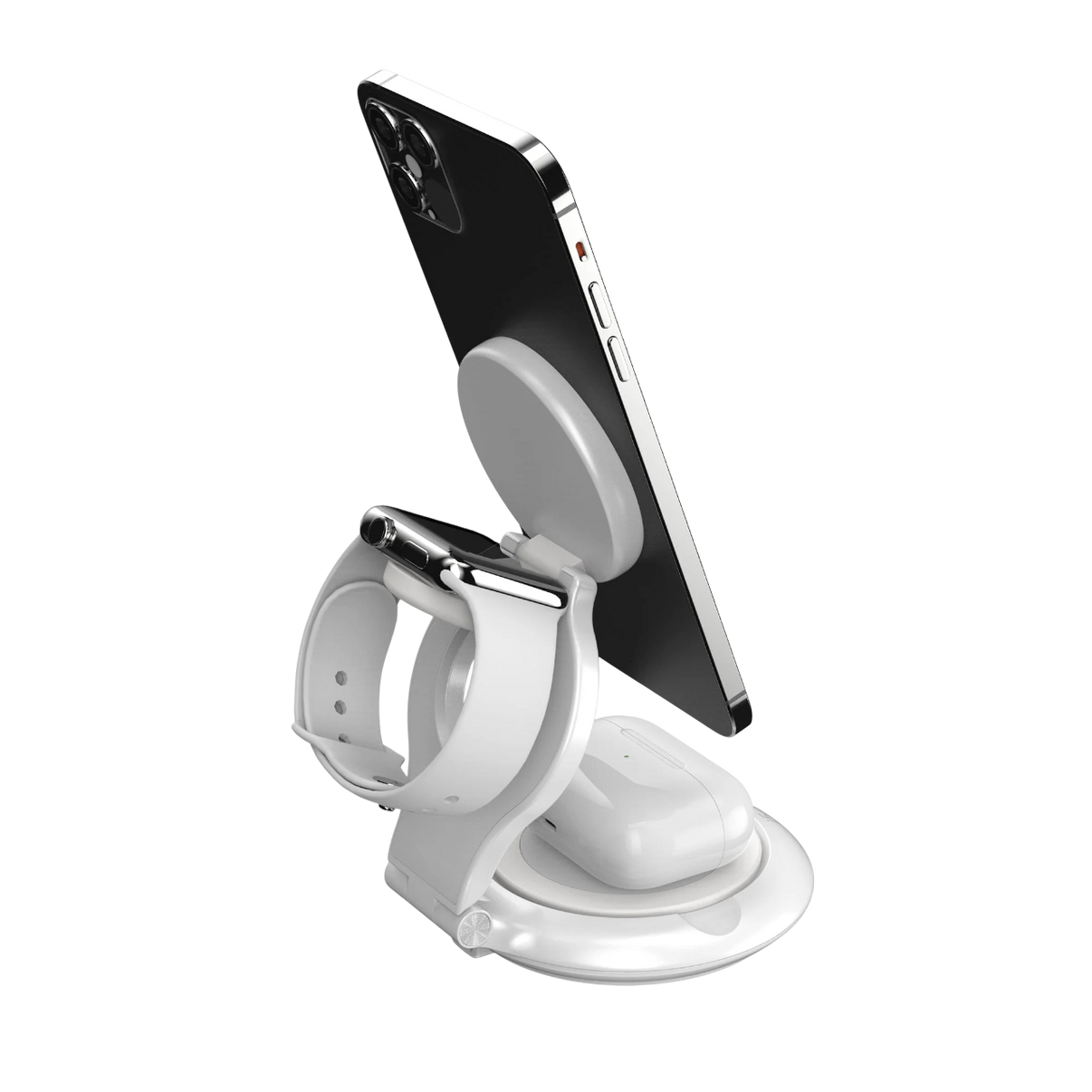 附 1 公尺 USB-C 線|Qi2 認證,15W 磁吸快充| 手機+手錶+耳機同時三合一無線充電|總輸出 22.5W|折疊立架橫直雙模式|多角度可調支架|三組 LED 燈狀態清晰|多重安全防護