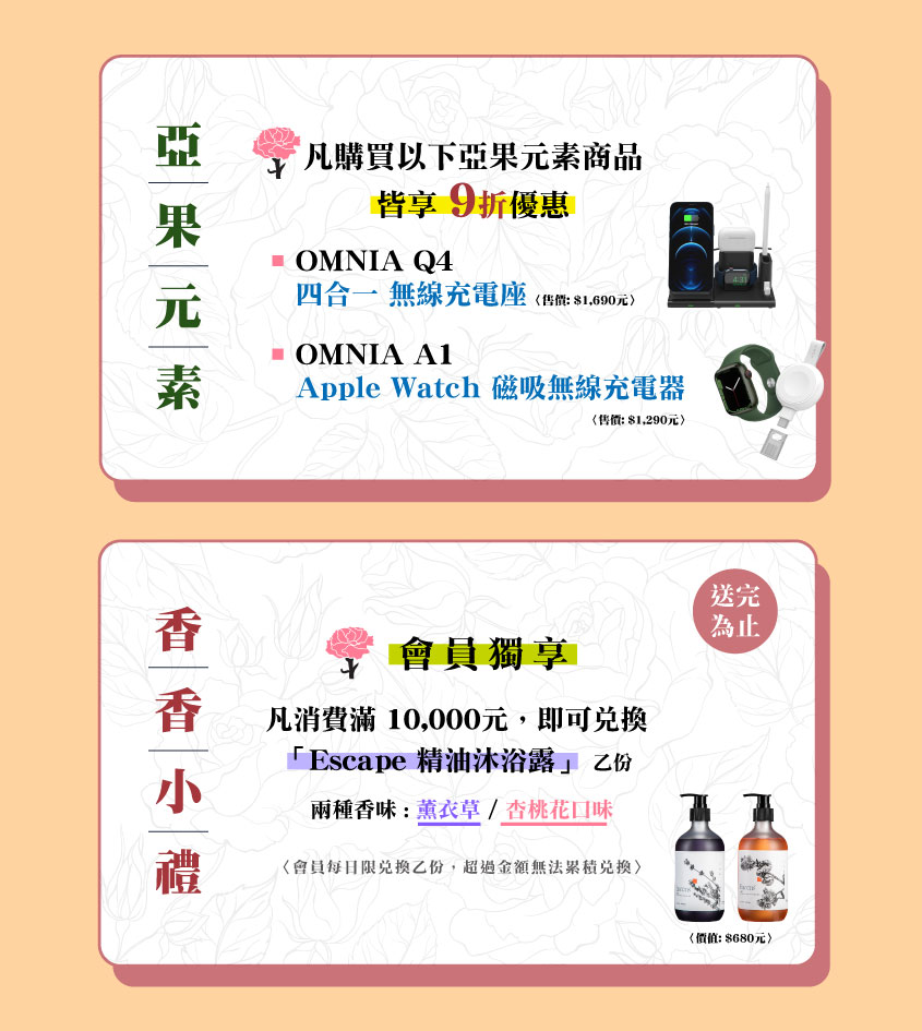 凡消費滿10,000元,即可兌換「Escape 精油沐浴露」壹份(薰衣草/杏桃花口味)(價值680元),送完為止阿